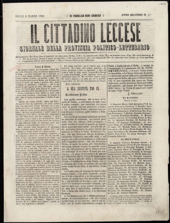 2) Il cittadino leccese : giornale della provincia politico letterario, n.1 dell’8 marzo 1862 Biblioteca provinciale Nicola Bernardini – Lecce. Fonte: ICCU Internetculturale.