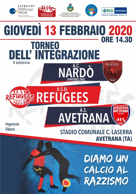Giovedì 13 febbraio, a partire dalle ore 14.30, si svolgerà la seconda edizione del “Torneo dell’integrazione” presso il campo sportivo comunale “C. Laserra” di Avetrana. La manifestazione è organizzata dall’USD A.S. Avetrana e Cooperativa Rinascita, ente attuatore dei progetti Siproimi/Sprar del Ministero dell’Interno, il Comune di Avetrana, la Lega Nazionale Dilettanti – Comitato FIGC Puglia e la Banca di Credito Cooperativo di Avetrana.