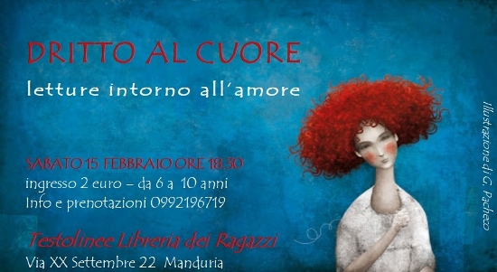 Sabato, alle ore 18.30, la libreria dei ragazzi “Testolinee” organizza “Dritto al cuore”, una serata di letture insieme ai bambini. Saranno proposte storie che indagano l’amore, il misterioso e complesso sentimento che tanto affascina l’essere umano.