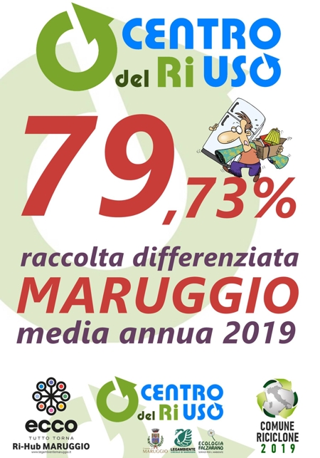 Grazie all’Amministrazione comunale, agli instancabili ragazzi della Ecologia Falzarano - Igiene Urbana Maruggio ed all’impegno e senso civico di ogni cittadino maruggese e residente estivo; possiamo festeggiare oggi un’incredibile 80% di raccolta differenziata (media annua) per il 2019!