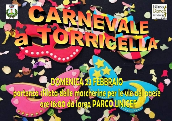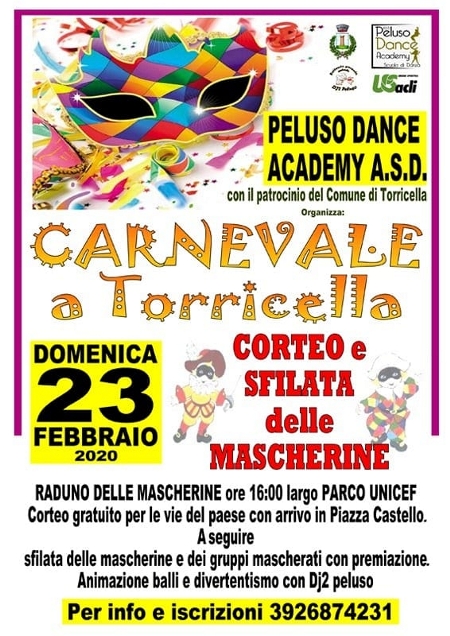 Domani (domenica 23 febbraio) si svolgerà la prima edizione del “Carnevale a Torricella”, organizzato da “Peluso Dance Academy” e patrocinato dal Comune di Torricella.