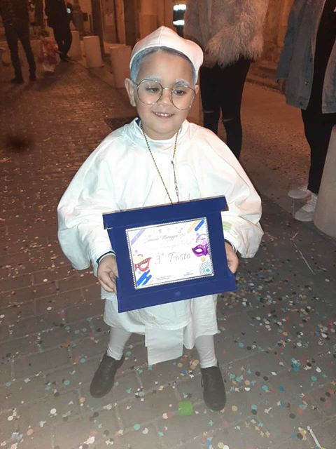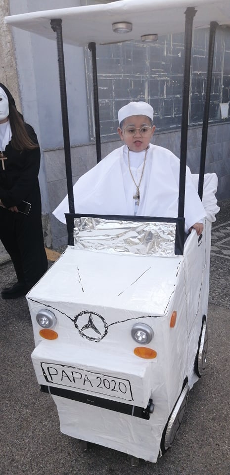 Si chiama Peppe Pio Longo, ha 5 anni e si è classificato al terzo posto della sezione Famiglia Felice del Carnevale Maruggese 2020. Non solo indossava una veste talare così importante, ma è riuscito anche a ben impersonare il Pontefice.