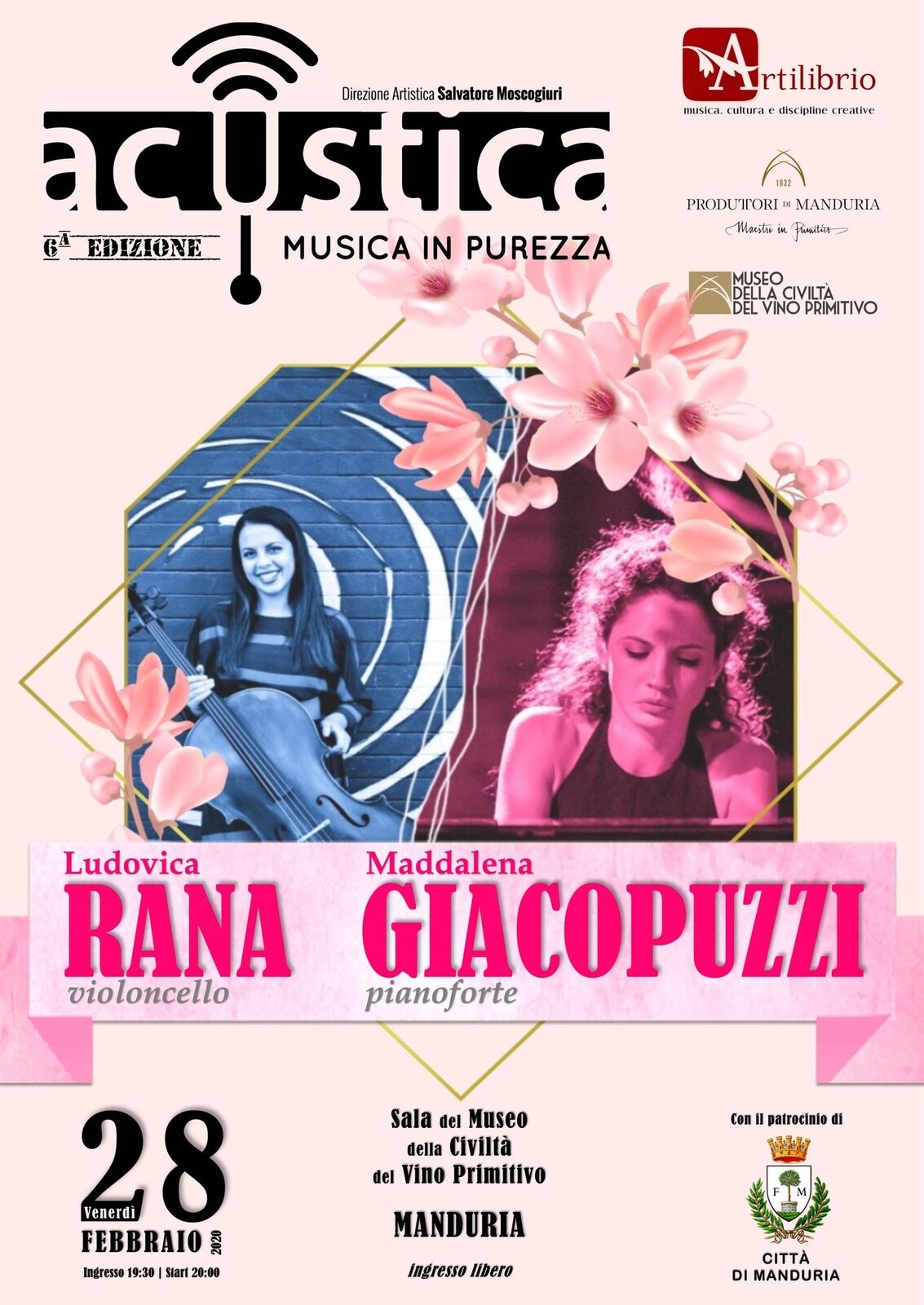 Straordinario talento, studio e passione sono gli ingredienti declinati al femminile dell’ultimo concerto di “Acustica - musica in purezza”, edizione 2019-2020. Il duo composto da Ludovica Rana al violoncello e Maddalena Giacopuzzi al pianoforte venerdì 28 febbraio chiuderà la 6a stagione della rassegna musicale, guidata dalla direzione artistica di Salvatore Moscogiuri per Artilibrio, con la partnership organizzativa di Produttori di Manduria.