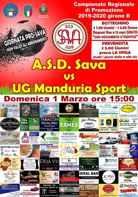 E’ stato ribattezzato “Derby del Primitivo”. Metterà questo pomeriggio di fronte, al “Camassa”, il Sava, terzo in classifica con 40 punti, e il Manduria, quinto in classifica con 39 (ma il presidente Palmisano ha annunciato di voler ricorrere al Collegio di Garanzia dello Sport per ottenere la cancellazione del punto di penalizzazione, dopo il verdetto negativo della Corte Federale di Appello). In programma, nella decima giornata di ritorno, anche un altro scontro diretto per la conquista dei tre posti della griglia dei play off (il quarto andrà alla squadra che, fra Racale e Matino, non riuscirà a vincere il campionato): ad Ostuni (terzo con il Sava), arriva il Taurisano, sesto con 36 punti (Ostuni e Taurisano hanno però disputato una gara in più).