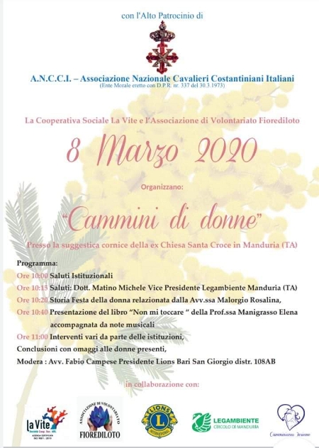 L’evento è organizzato dalla cooperativa sociale “La vite” e dall’associazione di volontariato “Fiorediloto”, con l’alto patrocinio dell’associazione nazionale “Cavalieri Costaniani Italiani” e in collaborazione con Lions Club Bari San Giorgio, Legambiente di Manduria e comunità alloggio “Camminiamo insieme”.