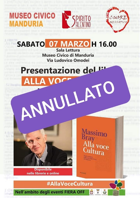 «La presentazione del libro “Alla voce cultura” è annullata. La decisione è il risultato di un comune accordo tra Museo Civico di Manduria, la cooperativa Spirito Salentino, il gruppo di gestione Cuore Messapico, la libreria Caforio Libri e musica, la casa editrice Manni Editori e la segreteria di presidenza e direzione generale dell’Istituto dell’Enciclopedia Italiana del direttore Massimo Bray, nel rispetto delle misure di contenimento del contagio varate dal Governo con il Dpcm
