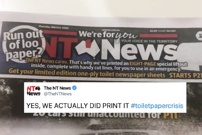 Il cibo c’è, l’acqua pure, manca la carta igienica. E Nt News, giornale satirico di Darwin, ha pensato di contribuire a modo suo a questa bizzarra carenza. Ha stampato un’edizione speciale con un inserto di otto pagine con le linee tratteggiate, che possono essere staccate e usate come carta igienica. «Sì, in effetti, lo abbiamo fatto», ha twittato Nt News postando un mini video che mostra lo sfoglio dell'inserto.