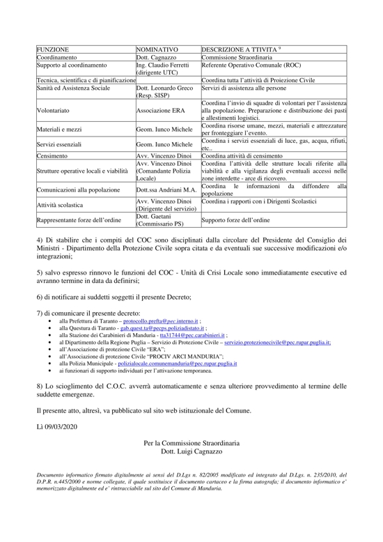 «E’ stato istituito il Centro Operativo Comunale (COC), quale organismo di comando e controllo a livello comunale per la gestione dell’emergenza dovuta a EPIDEMIA DA COVID19. Il predetto C.O.C. troverà ubicazione presso la sala convegni ubicata nella attuale sede fieristica sita in Manduria circonvallazione TA-LE.