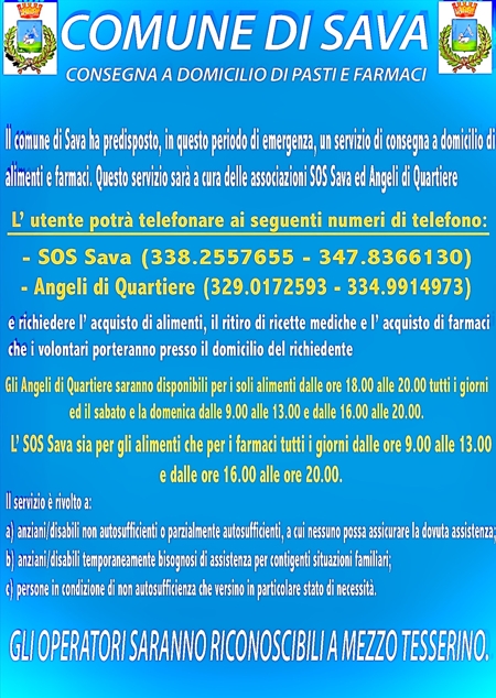 «Da ieri a Sava è attivo un nuovo servizio necessario in questo periodo di emergenza» afferma il primo cittadino savese Dario Iaia. «E’ a favore degli anziani e delle categorie più deboli. Il Comune di Sava ha organizzato, grazie al sostegno e alla collaborazione delle associazioni “SOS Sava” e “Angeli di Quartiere”, il servizio di consegna dei farmaci e dei pasti a domicilio. Chi è da solo, anziano o disabile e non può muoversi da casa per andare a fare la spesa o per acquistare i farmaci può telefonare ad una delle due associazioni e chiedere aiuto. I numeri delle due associazioni sono i seguenti: 338/2557655 o 347/8366130 “Sos Sava” e 329/0172593 e 334/9914973 “Angeli di Quartiere”. I volontari raggiungeranno a casa chi ha bisogno e avrà contattato le associazioni e aiuteranno i cittadini savesi in questo momento di difficoltà.