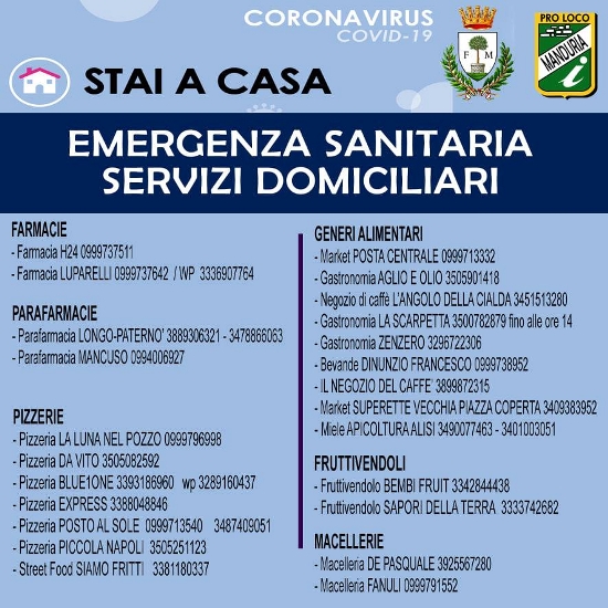 Inoltre è attivo un numero solidale per assistenza domiciliare agli anziani e disabili che non possono uscire da casa per i bisogni primari (spesa, farmacia, ecc..): i volontari della Protezione Civile Era e Pro Loco di Manduria acquistano e portano la spesa ai soggetti deboli che richiedono tale servizio. Il numero sempre attivo è 380 428 5603.