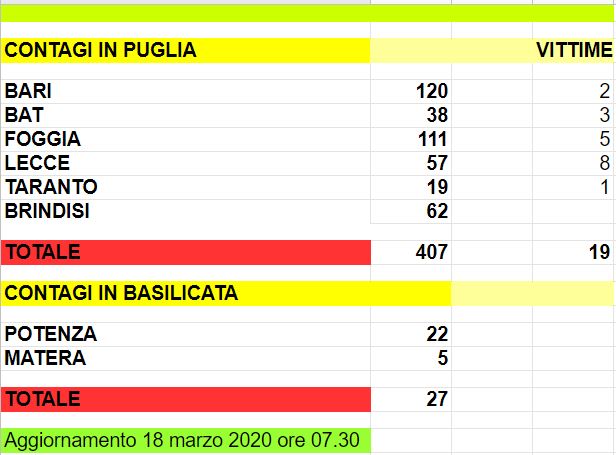Con questo aggiornamento salgono a 407 i casi positivi registrati in Puglia per l'infezione da Covid e 19 i deceduti.