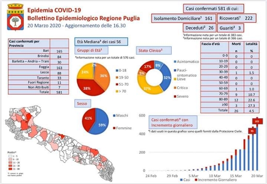 In Puglia peraltro continuano ad arrivare persone provenienti dalle regioni del Nord (907 sono le autocertificazioni inviate alla Regione solo nella giornata del 18 marzo, data dell’ultimo aggiornamento) e con esse arrivano anche potenziali contagi.