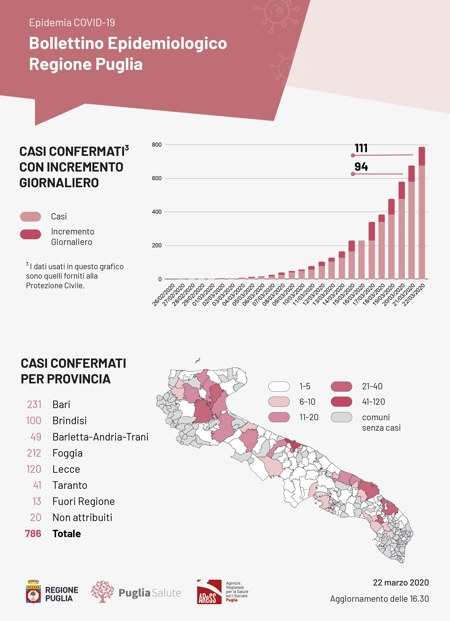 Il totale dei casi positivi Covid in Puglia è di 786, così divisi: