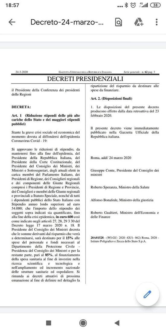La bufala questa volta corre in chat, per la precisione su Whatsapp e su Facebook. Si tratta di una finta Gazzetta ufficiale che riporta un decreto inesistente che ridurrebbe a 600 euro lo stipendio di tutte la alte cariche dello Stato - dal presidente Sergio Mattarella, al premier Giuseppe Conte a scendere - e di tutti i dipendenti pubblici con retribuzione superiore a 54mila euro lordi all'anno. Il decreto fake, che ha tratto in inganno molti, spiega anche che il 15% dei soldi risparmiati sarà devoluto alla Protezione civile, e il restante 85% al finanziamento della spesa sanitaria e della ricerca scientifica e “nell’ampliamento ed incremento nazionale delle strutture sanitarie e ospedaliere”.