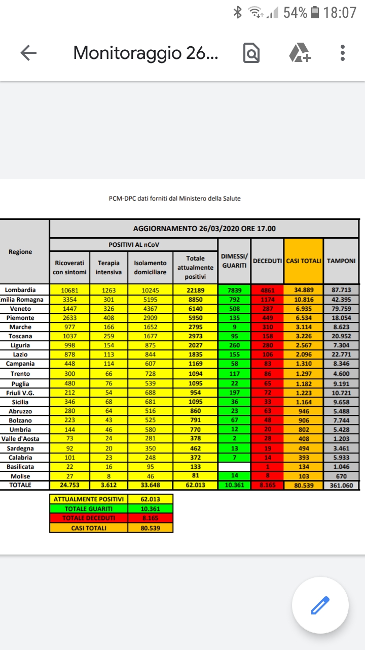 In Italia, dall’inizio dell’epidemia di Coronavirus, 80.539 persone hanno contratto il virus Sars-CoV-2 ((sono 6.153 rispetto a ieri per una crescita dell’8,3%). Di queste, 8.165 sono decedute (+662, 8,8%) e 10.361 sono guarite (+999, 10,7%). Attualmente i soggetti positivi sono 62.013 (il conto sale a 80.539 — come detto sopra — se nel computo ci sono anche i morti e i guariti, conteggiando cioè tutte le persone che sono state trovate positive al virus dall’inizio dell’epidemia). I dati sono stati forniti dalla Protezione civile.