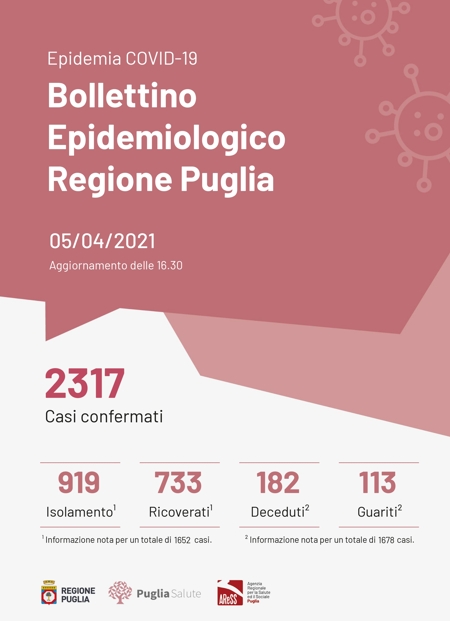 Il totale dei casi positivi Covid in Puglia è di 2.317 così divisi:
