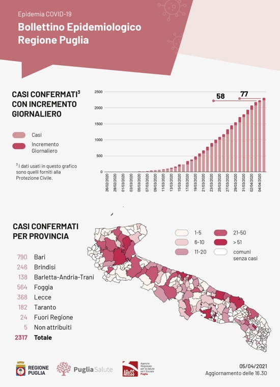 Il presidente della Regione Puglia, Michele Emiliano, sulla base delle informazioni del direttore del dipartimento Promozione della Salute Vito Montanaro, informa che oggi domenica 5 aprile, in Puglia, sono stati registrati 1.103 test per l'infezione da Covid-19 coronavirus e sono risultati positivi 77 casi, così suddivisi: