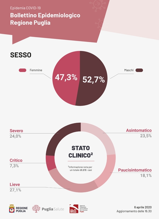 Per quanto riguarda la nostra provincia, assodato che i casi positivi di manduriani residenti e domiciliati a Manduria restano 6, oggi vengono attribuiti 8 casi positivi all’intero territorio tarantino. E’ probabile che oggi siano stati conteggiati i 4 casi di Grottaglie, così come solo oggi è stato conteggiato il decesso avvenuto fra sabato e domenica nella nostra provincia.