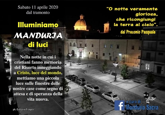 Gli amministratori della pagina facebook “Manduria Sacra” lanciano un’iniziativa per la serata di domani: “Illuminiamo Manduria di luci”.
