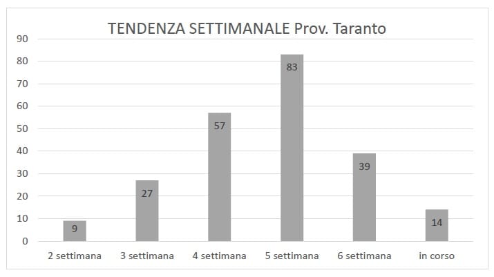 In basso abbiamo pubblicato un altro grafico di Francesco Franco. Descrive la tendenza dei casi nella provincia di Taranto. Anche per la nostra provincia, i dati di questa settimana sono estremamente incoraggianti: appena 14. Quindi sicuramente meno della scorsa settimana (39), della quinta settimana (83) e della quarta settimana (57). Se fra domani e domenica si verificheranno meno di 13 casi, avremo un totale migliore anche rispetto alla terza settimana (27) e ci avvicineremo sempre più a quello della seconda settimana (9).
