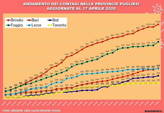 Nel grafico di Angelo Camassa l’andamento dei contagi nelle province pugliesi.