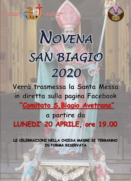 La pandemia impedisce le celebrazioni ufficiali della festa patronale in onore di San Biagio. Quest’anno, pertanto, i riti religiosi si svolgeranno nella chiesa Madre, ma in forma riservata. Chi volesse ugualmente assistervi, lo potrà fare, a partire da lunedì sera, 20 aprile, alle 19, collegandosi alla pagina facebook “Comitato S. Biagio Avetrana”. Lunedì, infatti, inizierà la novena.