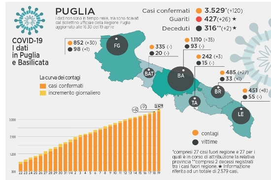 Il totale dei casi positivi Covid in Puglia è di 3.529 così divisi: