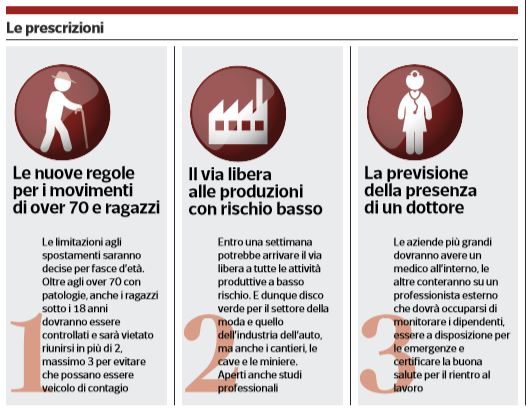 Un piano per la ripartenza per tappe: le attività riprenderanno nelle prossime quattro settimane, a scaglioni. Secondo il calendario stilato dal governo la riapertura di fabbriche e negozi sarà spalmata su quattro lunedì, a partire dal 27 aprile.