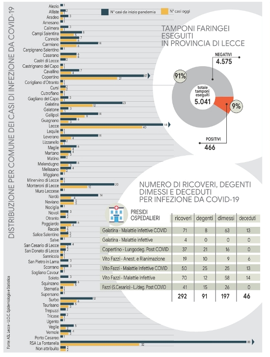 Guardando ai Comuni più rappresentativi, si vede come a Lecce - sempre secondo il report Asl - dei 64 casi registrati ad oggi, 40 risultino ancora positivi; a Copertino si passa da 47 a 21; a Galatina da 23 a 12; a Nardò, da 14 a 4; a Monteroni da 20 a 10; a Carmiano da 14 a 6; a Gallipoli da 14 a 9; Campi Salentina da 8 a 5; Poggiardo da 6 a 4. A Casarano, invece, il rapporto è stabile con 6 positivi iniziali su 6 attuali, e così pure a Matino (5 su 5).