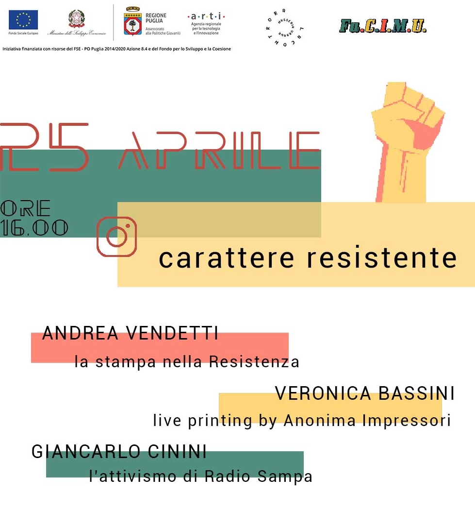«Sarà un momento in cui celebrare questa giornata con due artigiani e makers analogici d’eccezione: Andrea Vendetti, grafico, fondatore di Slab, ricercatore in Design a La Sapienza e laureato con una tesi sulle tipografie clandestine durante la Resistenza italiana, e Veronica Bassini, fondatrice e CEO di Anonima Impressori, una delle tipografie analogiche italiane di maggiore prestigio» è riportato in una nota della masserie urbana “La Controra”. «Andrea ci parlerà di caratteri clandestini e di storie di comunità di stampatori dall’armistizio alla fine della II Guerra Mondiale e Veronica ci mostrerà in diretta alcuni processi di stampa al torchio di un manifesto del 25 aprile.
