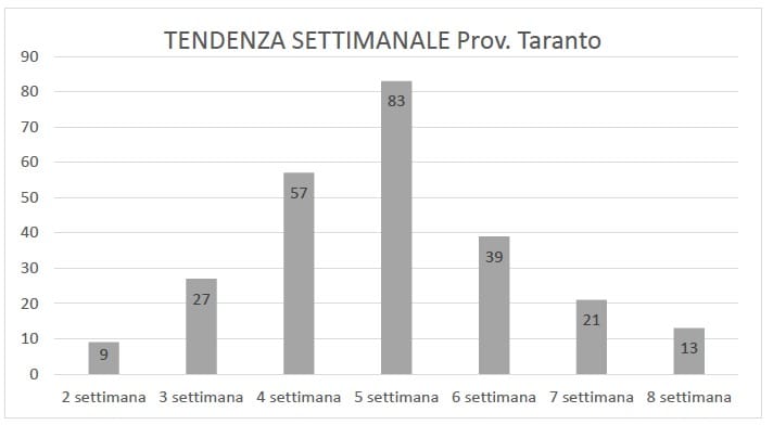 TARANTO – Stessa tendenza per la provincia di Taranto, che ha chiuso la settimana scorsa con appena 13 contagi. Un dato questo inferiore a quelli della settima settimana (21), della sesta (39), della quinta (83), della quarta (57) e della terza (27).