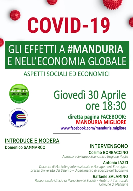 «È questo lo spunto di riflessione dal quale partirà l’evento in diretta facebook sul tema “Gli effetti del Covid-19 a #Manduria e nell’economia globale” da noi organizzato e che vedrà la presenza, oltre che di. Domenico Sammarco nel ruolo di moderatore, dell’assessore allo Sviluppo Economico della Regione Puglia Cosimo Borraccino, che relazionerà sugli effetti e risvolti del Covid sul commercio, industria e sul territorio, e del docente di Marketing Internazionale e Management Atrategico presso Università del Salento Antonio Iazzi, che toccherà il tema degli aiuti economici e finanziari alle alle imprese per la ripresa nel medio-lungo periodo. Infine il responsabile dell’Ufficio di Piano dei Servizi Sociali – Ambito Territoriale 7 – del Comune di Manduria, Raffaele Salamino, relazionerà sugli strumenti a supporto dei Servizi Sociali per il superamento della crisi sociale.