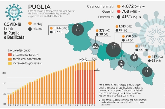 A partire da lunedì 4 maggio, intanto, anche il settore della sanità potrà tornare ad una lenta normalità: ospedali pubblici e privati e ambulatori potranno nuovamente effettuare ricoveri ed esami e visite non urgenti. È, infatti, pronta la disposizione del direttore del Dipartimento Salute, Vito Montanaro, che autorizza Asl e ospedali alla ripresa dei servizi. Anche i centri diurni, le Rsa, le Rssa potranno riprendere l’ordinaria attività - dopo aver rilevato l’isolamento dei «focolai» scoppiati anche in Puglia – mentre per i Cup, i centri unici di prenotazione, bisognerà attendere ancora.