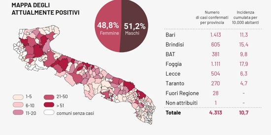 Il totale dei casi positivi Covid in Puglia è di 4.313 così divisi: