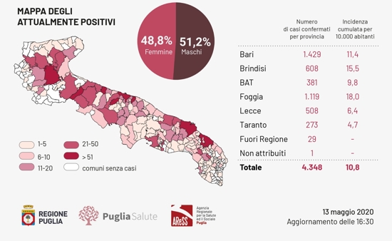 Il totale dei casi positivi Covid in Puglia è di 4.348, così divisi:
