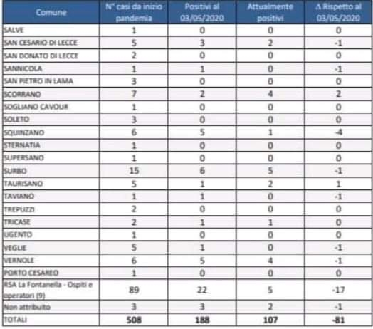 Contagio azzerato ad Aradeo (dai 3 iniziali), a Carpignano (uno solo), a Castrì (erano 2), a Corigliano (1), Gagliano (3), Galatone (5), Maglie (6), Matino (2), Melissano (4), Miggiano (1), Minervino (1), Nociglia (1). Otranto (2), Salve (1), San Donato (2), Sannicola (1), San Pietro in Lama (3), Sogliano Cavour (1), Soleto (3), Sternatia (1), Supersano (1), Taviano (1), Trepuzzi (2), Ugento (1), Veglie (5), Porto Cesareo (1).