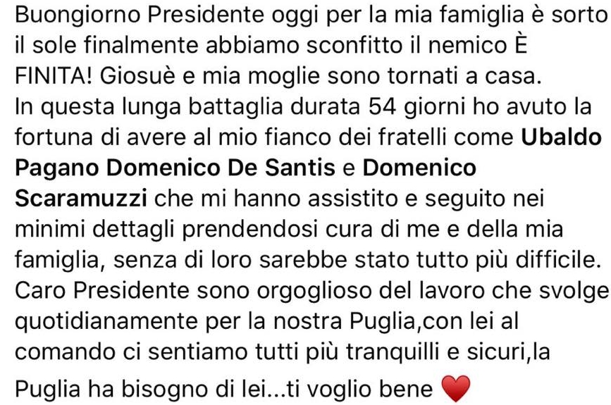 «Il 9 aprile scorso, nel pieno della tempesta Covid, è nato un bambino di nome Giosuè. Sua madre, suo padre e i suoi tre fratelli avevano contratto il virus, mentre lui è risultato negativo» è riportato nel post del governatore Emiliano.