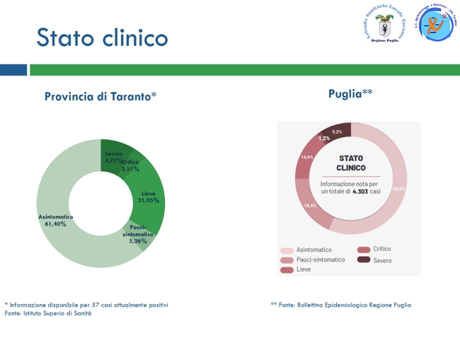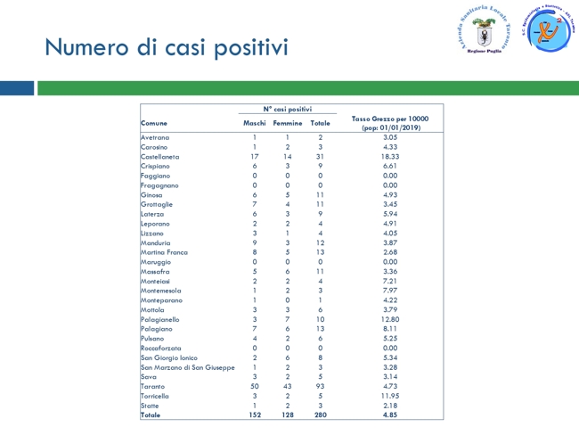 La Asl ha pubblicato un nuovo bollettino aggiornato dei casi di positività nella provincia di Taranto. Il dato è aggiornato al 26 maggio (ovvero a ieri) e, sostanzialmente, si differenzia con il precedente per i quattro casi in più di contagio (riguardano un uomo di Taranto e uno di Monteparano, nonché una donna di San Giorgio e una di Montemesola) e un decesso in più (una donna di Mottola).