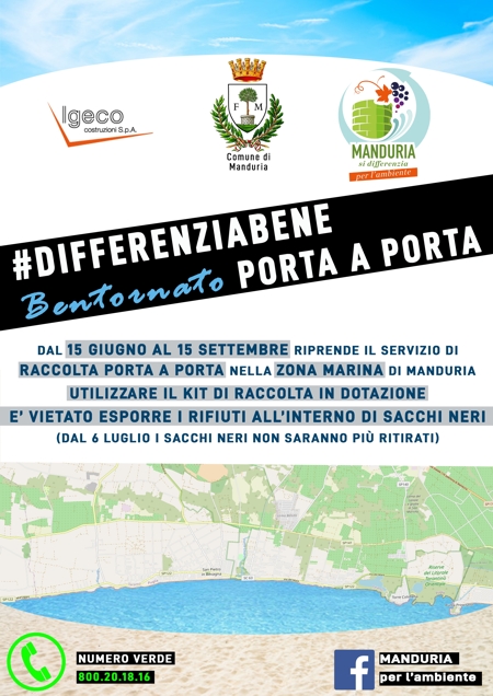 E’ ripartito il servizio di raccolta differenziata porta a porta dei rifiuti lungo tutti i 18 km di marina di Manduria: da Torre Borraco sino a Torre Colimena.