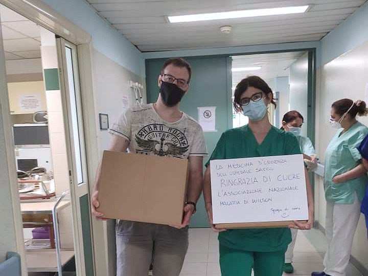 Per ringraziare la paziente Federica, infermiera presso il reparto d’urgenza Covid dell’ospedale Sacco di Milano, l’Associazione Nazionale Malattia di Wilson ha donato al reparto 540 mascherine FFP2 con filtro, 500 mascherine FFP2 senza filtro, 1.000 mascherine chirurgiche e 3 visiere protettive.