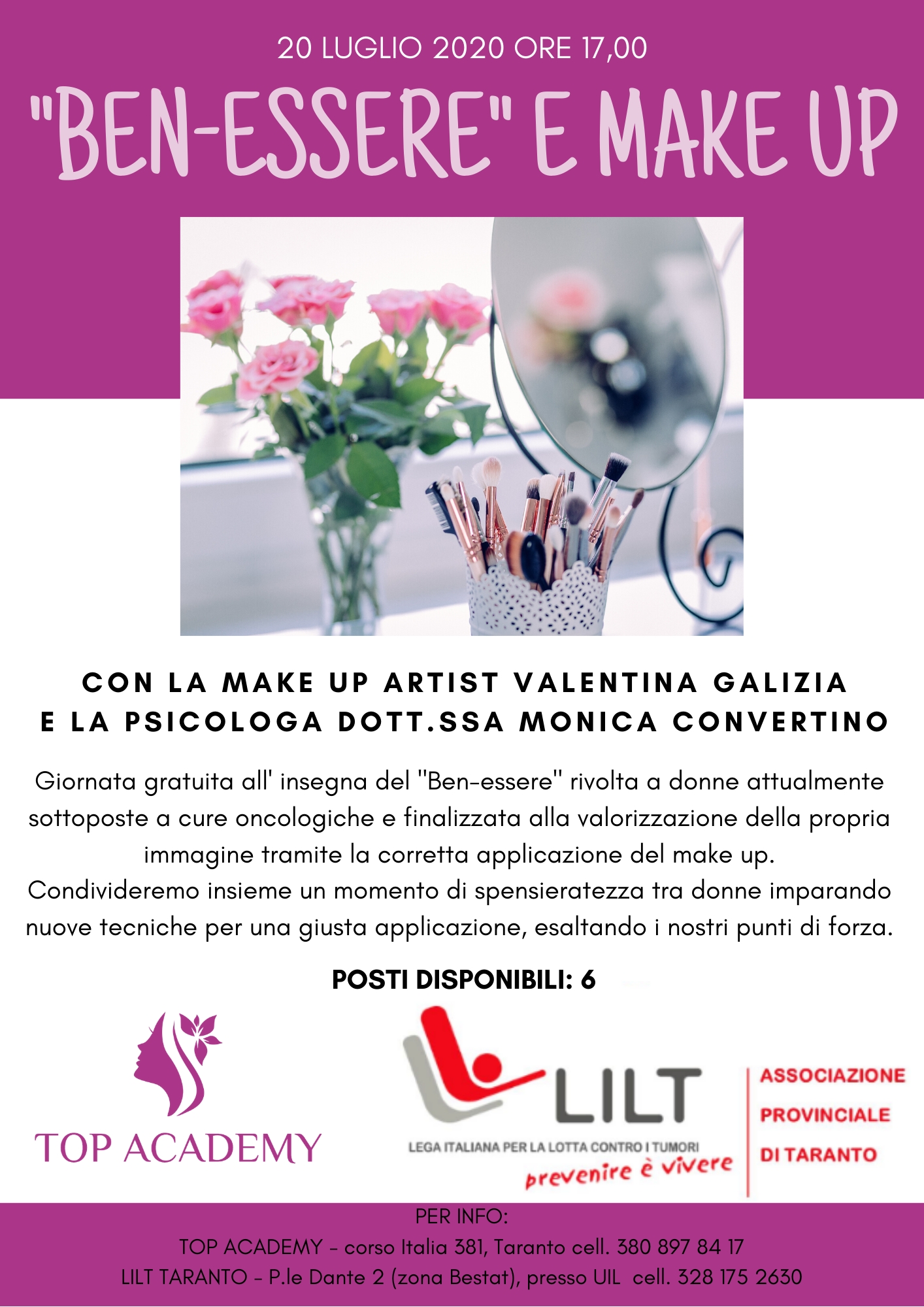 L’iniziativa, organizzata dall’accademia tarantina con il supporto della Lilt, sarà condotta congiuntamente dalla make up artist Valentina Galizia e dalla psicologa Monica Convertino.