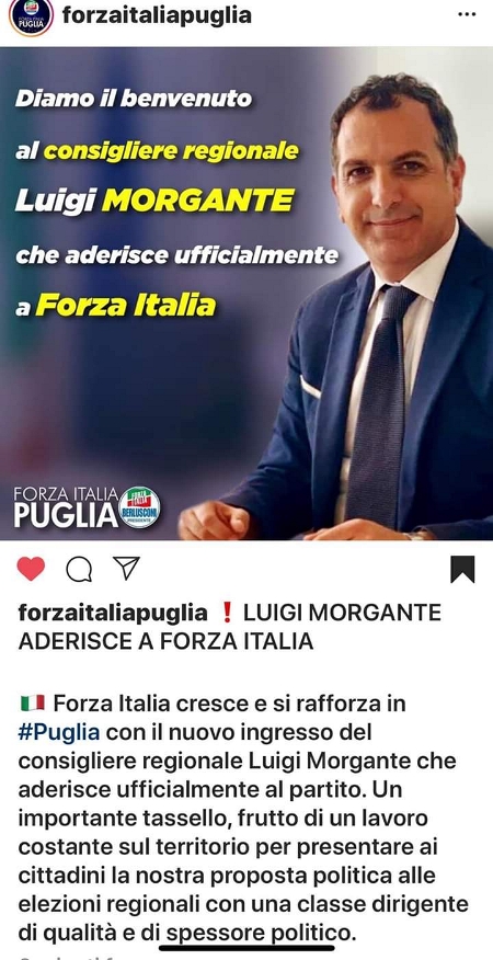 "Per me si tratta di un ritorno a casa, fortemente voluto e gratificante. Sono infatti onorato di poter ritornare nella famiglia di Forza Italia, dopo aver condiviso tutto il percorso politico sino al suo incipit del 1994 come semplice attivista per poi diventare consigliere comunale a Manduria nel 2002, e aver ricoperto diversi ruoli politici sino ad essere nominato vice coordinatore provinciale.