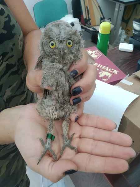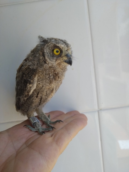 Tutti gli uccelli al momento del ricovero sono identificati nell'immediato con un anellino alla zampa (come il nostro piccolo assiolo, spaventato come lo é un bambino dal pediatra).