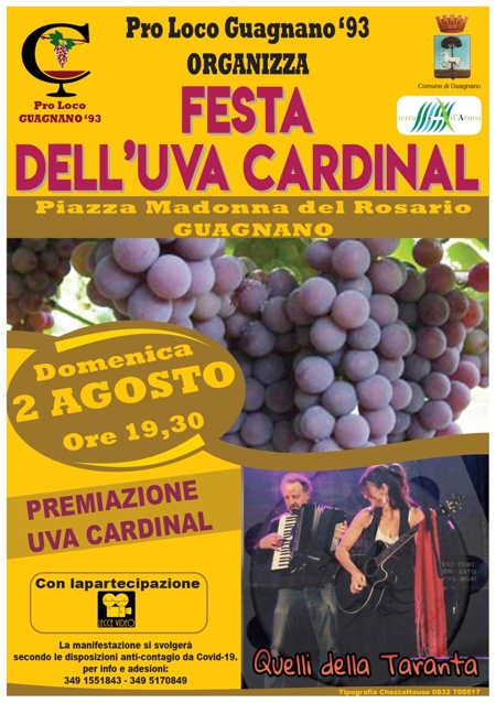 La manifestazione, che si svolgerà nel pieno rispetto delle normative anti-contagio da Covid-19, intende mantenere viva la tradizione della storica “Sagra dell’uva Cardinal e del vino”, di cui rappresenta una sorta di versione ridotta. A causa del periodo di lockdown, infatti, non è stato possibile programmare e predisporre la realizzazione del grande evento estivo di promozione del territorio firmato Pro Loco Guagnano '93, che quest’anno avrebbe raggiunto l’edizione numero 40. Ma si sa, il volontariato non si perde mai d’animo, e grazie alla “Festa dell’uva Cardinal” la preziosa uva tipica verrà comunque festeggiata e sarà possibile rivivere, pur nel rispetto delle normative vigenti, la bellezza dello stare insieme. Per info e adesioni: 3491551843 – 3495170849.