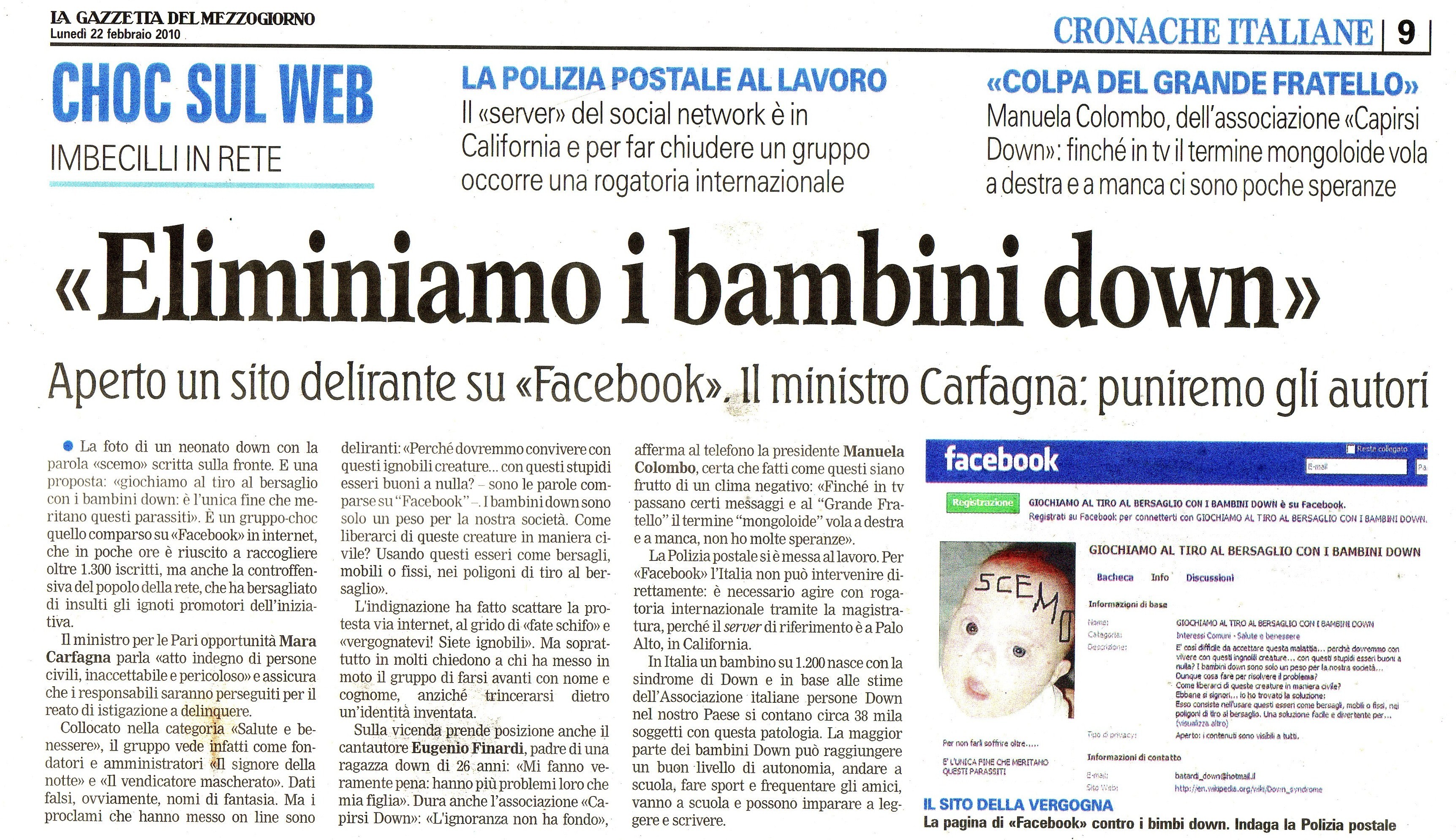 Questi spregevoli individui, caro Ministro, hanno scritto queste infamanti e becere frasi perchè non hanno mai conosciuto un bambino down e chi ti scrive ha una splendida sorella di nome Chiara che arricchisce ogni giorno la mia vita e quella della mia famiglia.Ti prego di essere il portavoce nel governo del dolore di tante mamme e famiglie che si sentono mortificate da questi delinquenti che vogliono rendere agli occhi della gente la diversità di bambini che sono invece solo speciali».