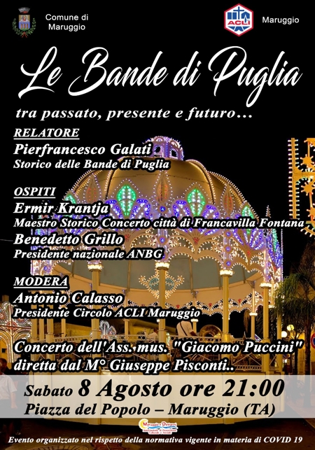 Si terrà sabato 8 agosto, alle 21, in piazza de Popolo a Maruggio, il convegno a carattere regionale sul tema “Le bande di Puglia, tra passato presente e futuro”.