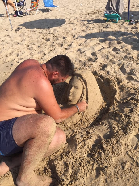 Da un lustro, è facile imbattersi nelle sue splendide sculture di sabbia