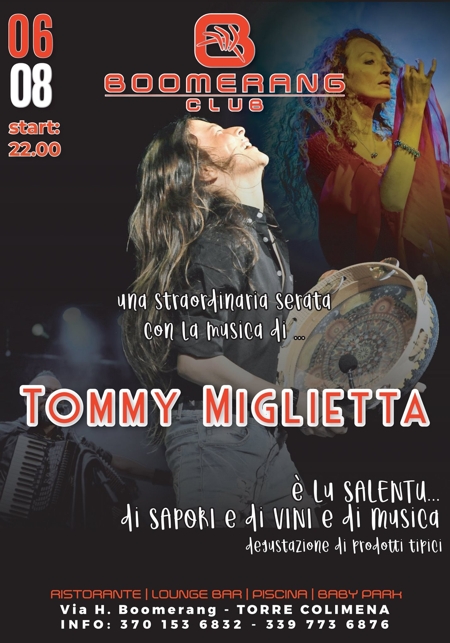 Questa sera (giovedì 6 agosto) una straordinaria serata con la musica di Tommy Miglietta e un viaggio enogastronomico tra i prodotti tipici della tradizione pugliese.