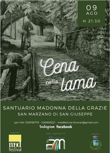 In questa estate particolare, domenica 9 agosto, dalle ore 20.30, si svolgerà la Cena nella Lama presso il santuario Madonna delle Grazie di San Marzano di San Giuseppe. È un evento prodotto da MedFestival Puglia e organizzato dalla Pro Loco Marciana con il patrocinio del Comune.
