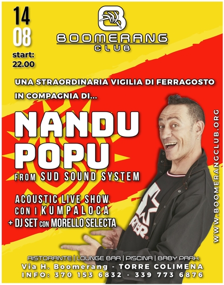 Venerdì 14 agosto una straordinaria vigilia di Ferragosto in compagnia di Nandu Popu, from Sud Sound System, acustic Live con Kumpaloca e a seguire dj set con Morello Selecta.